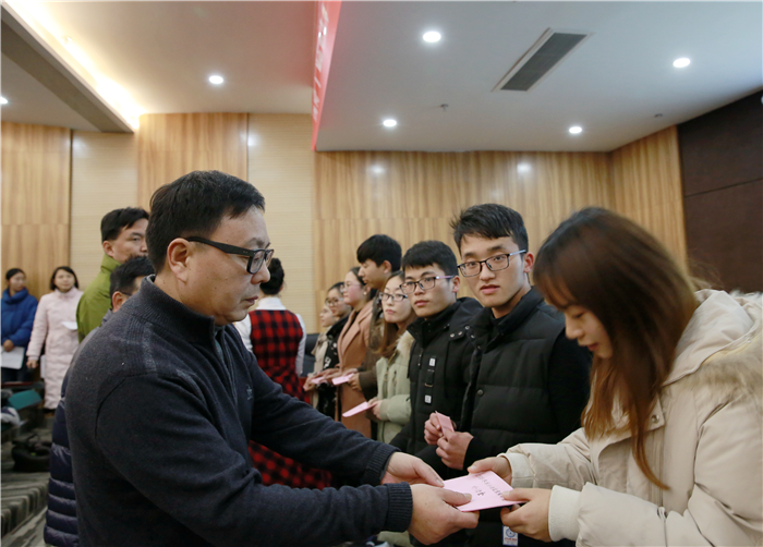 寒假路费受助学生代表临床医学院徐波发言,他表示冬至当归,一张小小车票,既是学子的乡愁,又是父母的期盼,自己定会刻苦努力学习,取得优异成绩,回家给父母报喜。冬衣资助受助学生代表针灸推拿学院林治波同学发言,今天自己是爱的接受者,明天,我们会是爱的传播者,作为大学生必应常怀感恩之心,常举感恩之行。