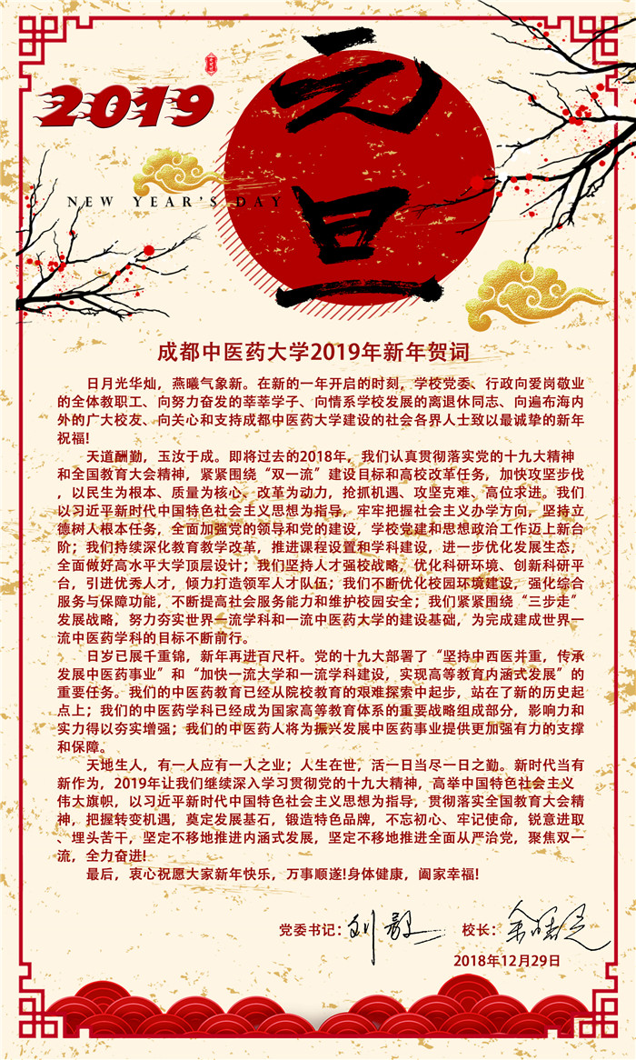 2019年新年贺词 发布时间:2018-12-29 23:54:00 浏览次数: 次 【字体:小 大】 【打印正文】 上一条:2018—2022年教育部高等学校中医学 中西医结合类专业教学指导委员会成立 下一条:Beat365官网第二届国际生物医药与中医药青年论坛开幕