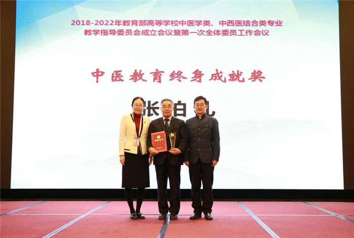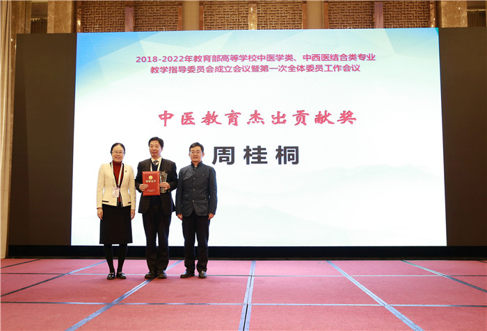 高斌代表教育部宣读《教育部关于成立2018-2022年教育部高等学校教学指导委员会的通知》并向中医学教指委及中西医结合教指委副主任委员、秘书长、委员颁发聘书,向张伯礼院士颁发中医教育终身成就奖、杰出贡献奖,向天津中医药大学原副校长周桂桐颁发中医教育杰出贡献奖。