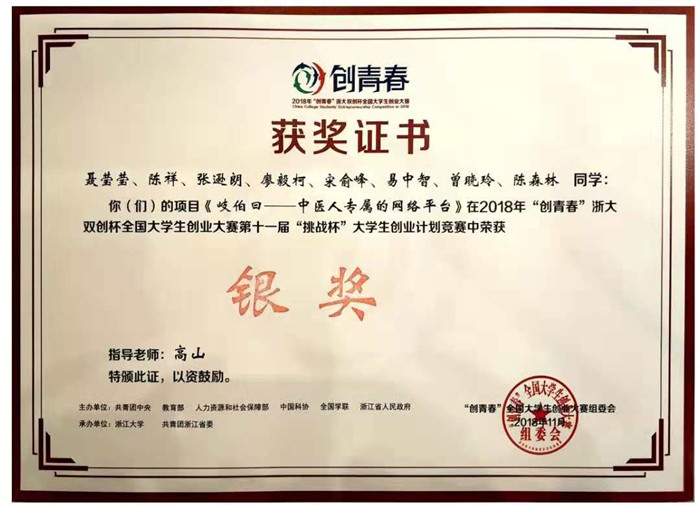 日前,由共青团中央、教育部、人力资源和社会保障部、中国科协等单位主办的2018年“创青春”浙大双创杯全国大学生创业大赛决赛在浙江大学举行。Beat365官网眼科学院推送项目《岐伯曰——中医人专属的网络平台》在创业计划竞赛中荣获全国银奖,创下Beat365官网近十年来在“创青春”“挑战杯”赛事上取得的最好成绩。