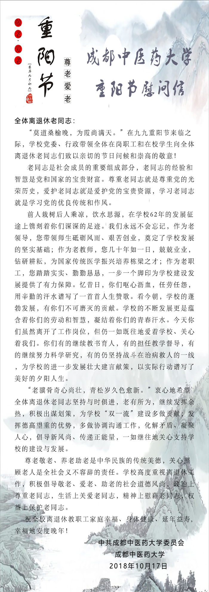 重阳节慰问信 发布时间:2018-10-16 16:12:00 浏览次数: 次 【字体:小 大】 【打印正文】 上一条:“四个好”“三个有” 学校承办会议深得与会代表赞许 下一条:公卫学子在四川省两项赛事中喜获佳绩