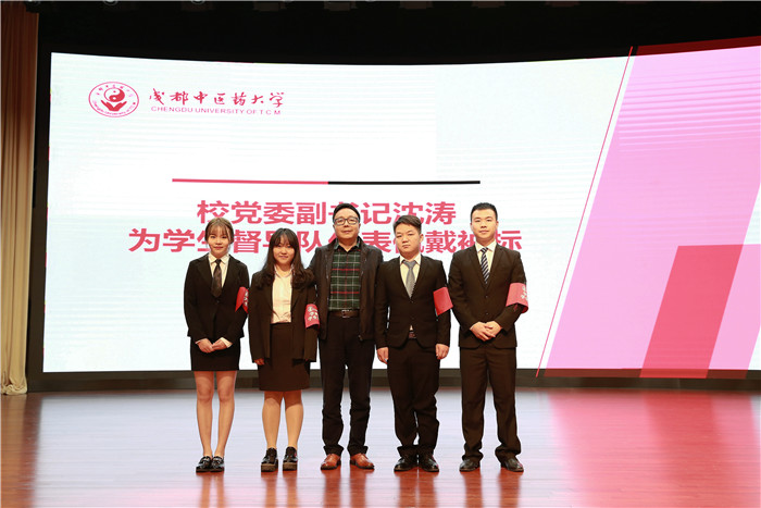 会上,沈涛为新成立的学风建设学生督导队代表佩戴袖标。