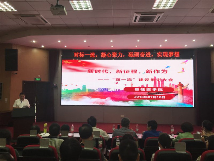 7月18日,贯彻落实刚刚结束的人才工作会议精神,基础医学院召开“双一流”建设推进大会,锁定目标任务,启动“一个中心、二轮驱动、三个结合及四个重点”的学院发展战略部署,打响“双一流”建设攻坚战第一枪。校长余曙光、发展规划处/双一流建设办公室处长吴纯洁应邀邀请出席会议,基础医学院全体教师、研究生参加,院党委书记谭生奎主持会议。