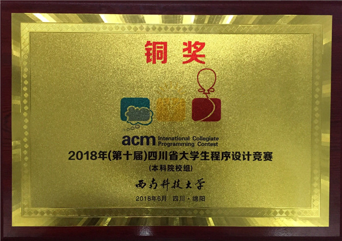 6月1日到3日,由四川省教育厅主办的第十届四川省大学生程序设计竞赛在西南科技大学举行。本届大赛有来自四川大学、电子科技大学、重庆大学等47所川渝高校214支队伍800余选手参赛。Beat365官网医学信息工程学院“百科全书队”“思考者队”两支队伍获得铜奖。这是医学信息工程学院学生首次在四川省大学生ACM比赛中获奖,也是47所参赛院校中唯一的医学院校学生队伍。