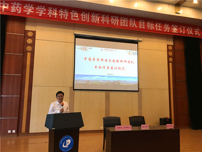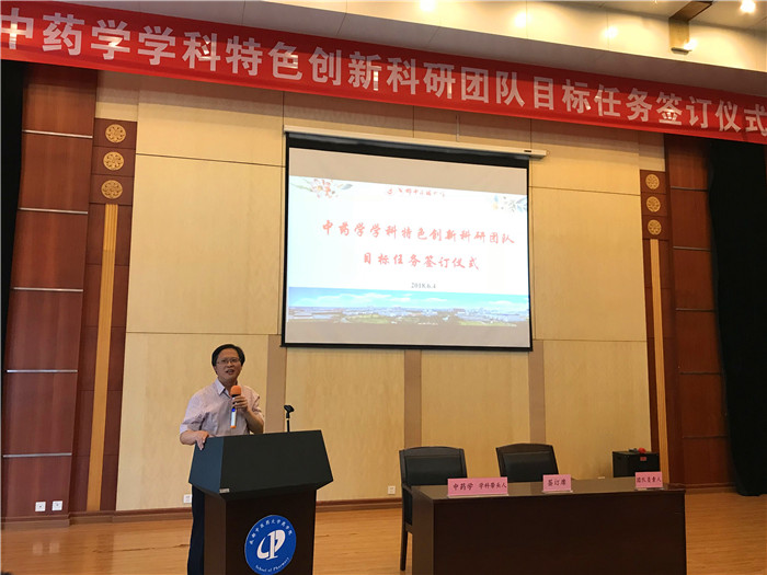 刘世云宣读了“关于组建中药学学科特色创新科研团队的通知”。为了完成中药学一流学科建设于2020年第一阶段的建设任务,药学院作为中药学学科建设的主体单位,成立了“特色创新科研团队建设领导小组”,在中药学学科内首批组建了21个特色创新科研团队。团队带头人与领导小组签订了目标任务书。傅超美作了题为“聚人心、明目标、再腾飞”的双一流学科建设情况汇报,从建设优势、存在不足、解决措施三个层面分析了当前中药学学科建设的情况。团队负责人代表李芸霞、团队成员代表张定堃两位老师发言,庄严承诺,在学校事业开启新征程的历史时期,将全心投入中药学学科建设中,继续发扬勇于拼搏、团结奋进的药学精神,继往开来承使命,众志成城创一流!