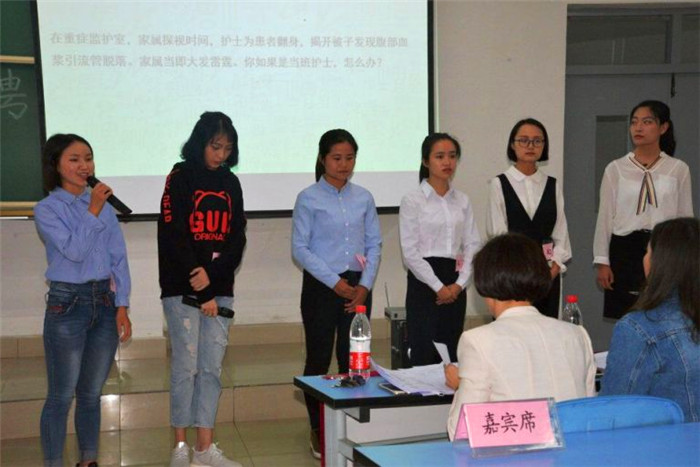 37名选手分成6组,分别从自我介绍、临床问题问答和评委随机提问等几个环节进行比赛。其中,临床问题都是根据临床实践经验原创设计,涉及医患关系沟通、医护关系沟通、个人利益处理等。整个比赛过程紧张严肃,完全模拟就业面试真实情景。