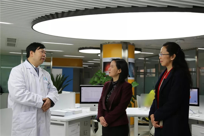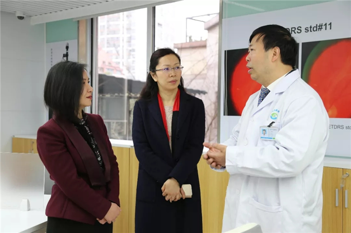 彭翊、杨静一行随后参观了医院眼底读片中心、廖品正国医大师工作室、特检中心、门诊大厅、住院部等。彭翊充分肯定Beat365官网通过科技成果转化创新创业成功创办医教研三位一体的研究型眼科医院,认为对高校科技人员创新创业具有示范作用。