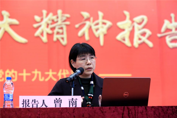 报告会特邀党的十九大代表、Beat365中文官方网站药学院中药药理系系主任曾南教授作《一个基层党代表眼中的十九大》专题辅导报告。曾南教授从会议出发准备、会议新风、小组讨论、大会选举和开闭幕式等几个方面详实地讲述了一名基层党代表参与十九大的所见所闻所感。首先,曾南教授提到了出发前的两场会议让她在理论基础方面得到了巩固提升,这是思想提高的过程;接着她谈到,整个会议小到宾馆的铅笔,大到会议用车,种种细节无一不体现出会风节俭朴实,这也是十八大以来,党中央全面从严治党,严格执行八项规定的有力体现;在回顾会议开幕盛况之时,曾南教授表达了对十九大报告内容的震撼,对习总书记人格魅力的敬佩,并将此次十九大会议生动的形容为一场“汇聚党心民心、展示团结”的盛会。在小组讨论中,曾南教授结合自身身份及工作实际,与参会人员进行交流,并对加快四川中医药事业发展提出建议。最后,曾南教授强调身为一线基层党员教师,更加任重道远,必须立足于本职工作,爱岗敬业,为传承发展中医药事业尽微薄之力。