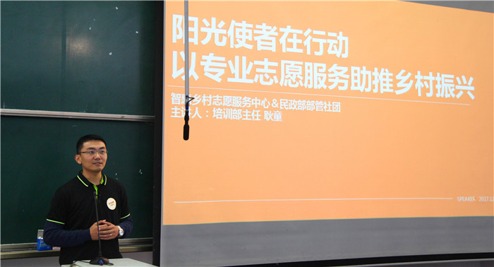 12月2日下午,由智惠乡村志愿服务中心与新浪四川主办,校青年志愿者协会承办的“阳光使者在四川”宣讲会在B教113教室举办。宣讲会由川大人居营造研习社社长丁雪莹、乡村建筑工作室联合创始人薛亮、幸福银行创始人赵松生、智惠乡村志愿服务中心培训部主任耿童担任主讲人。本次公益宣讲活动以国家《志愿服务条例》正式实施为契机,面向全国高校开展,以“乡村振兴、青年有为”为主题,旨在鼓励和引导高校青年以志愿者的形象和行动站在全社会的前列。