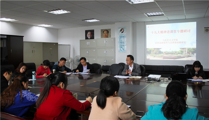 为深入学习贯彻党的十九大精神,切实做好十九大精神“进教材、进课堂、进头脑”,进一步提升思政课教学质量, 11月2日,马克思主义学院思想道德修养与法律基础教研室在百会堂5-4教室举行十九大精神进课堂专题集体备课会,思修课专兼职教师20余人参加备课会。