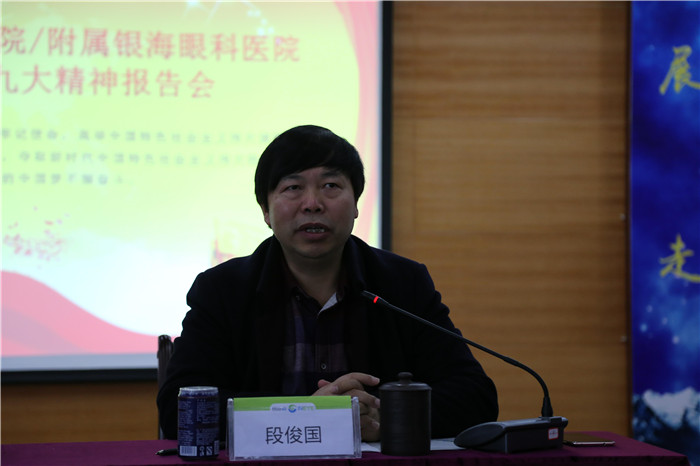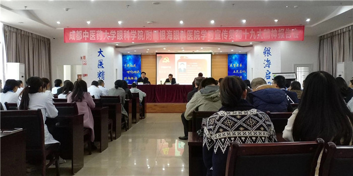 10月30日上午,Beat365中文官方网站眼科学院/附属银海眼科医院在医院六楼学术报告厅召开学习宣传贯彻党的十九大精神报告会,传达学习贯彻党的十九大和十九届一中全会精神。会议特别邀请学校党委书记刘毅教授和党的十九大代表、河北省眼科医院院长/党委书记张铭连教授作传达十九大精神的专题党课和报告。眼科学院/附属银海眼科医院党政领导班子成员、全体党员、中层干部、教职工及学生代表共计200余人出席本次会议,Beat365官网第二临床医学院、护理学院,金牛区人北街道办相关领导也出席会议。会议由眼科学院/附属银海眼科医院院长、书记段俊国教授主持。