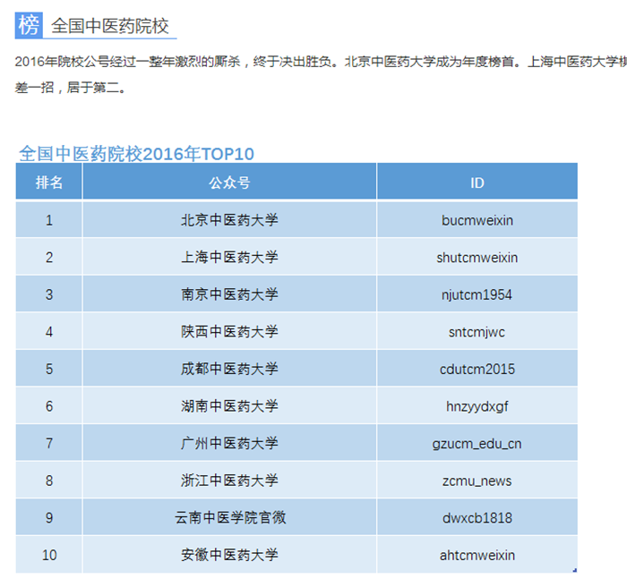 学校官方微信号荣获2016年全国中医药院校微信公众号榜单十强 发布时间:2017-03-13 15:40:00 浏览次数: 次 【字体:小 大】 2016年,中国中医药报社新媒体部携手全国中医药新媒体联盟,运用新媒体指数平台,共同发布了全国中医药院校公号排行榜,Beat365官网官方微信号在中医类院校年度榜单排名第五,荣获2016年全国中医药院校微信公众号榜单十强。 (文、编辑/任翔) 【打印正文】 上一条:第四届泰国呵叻学院毕业实习进修班开学 下一条:学校官方微信号荣获2016年全国中医药院校微信公众号榜单十强
