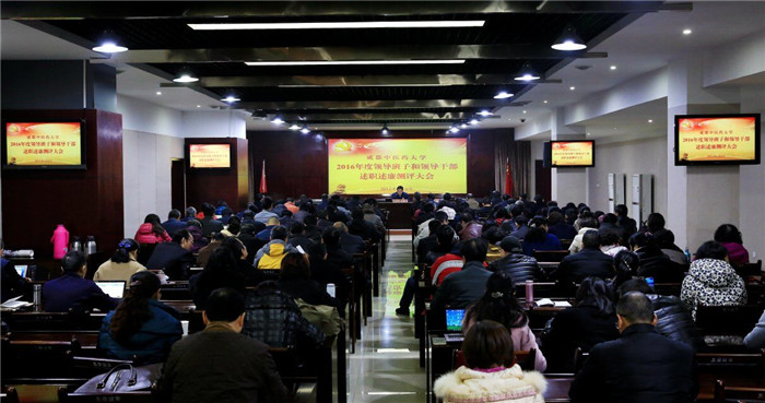 1月6日上午,2016年校领导班子及领导干部述职述廉民主测评大会在温江校区举行。党委书记刘毅代表学校领导班子作班子述职述廉报告,校领导作现场个人述职述廉报告。刘毅主持会议,全体校领导,中层领导干部,专家代表,人大、政协、民主党派、无党派知识分子代表,党代表,工会教代会代表,老领导代表等130余人参加会议。