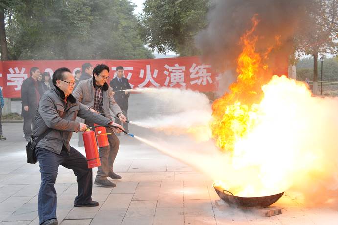 专题讲座后,参会师生来到室外进行灭火操作演练。
