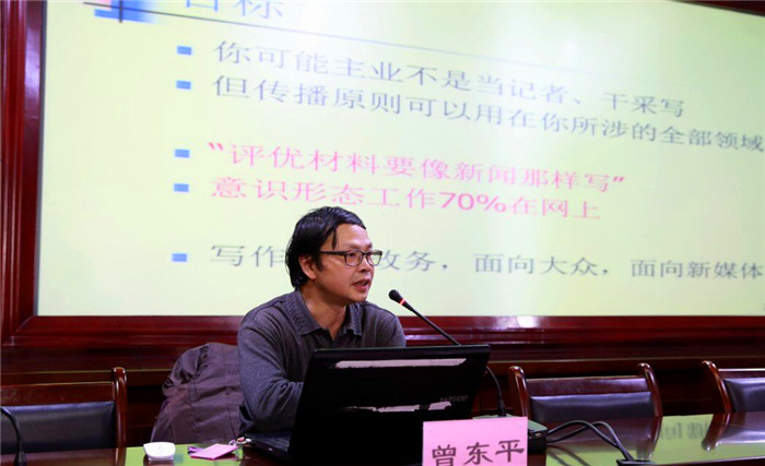 学校举行宣传工作业务培训会 发布时间:2016-12-22 10:05:00 浏览次数: 次 【字体:小 大】 12月21日下午,学校宣传工作业务培训会在温江校区行政楼第五会议室举行,四川日报《川报观察》客户端主编曾东平应邀为宣传部工作人员和学校全体宣传员作培训讲座。培训会由党委宣传部部长赖玉萍主持。 曾东平以自己长期在新闻工作第一线的经验为基础,以现代传播学理论为指导,结合大量生动贴近的案例,以新闻的特性和价值、新闻工作者的追求与素质、写好新闻的方法等论题为主要内容,并通过让大家修改稿件、选择图片等互动方式,为大家作了一场丰富精彩的新闻宣传业务培训。 (文/校报记者站 张宇 图/庞利红 编辑/刘承云) 【打印正文】 上一条:Beat365官网携手成都电视台《成都全接触》栏目传播冬至养生知识 下一条:学校举行宣传工作业务培训会