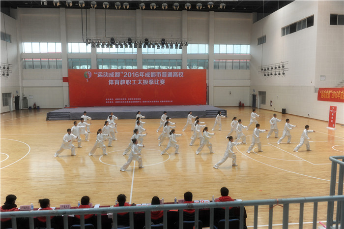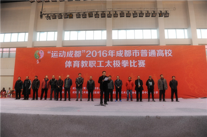 12月11日上午,由成都市体育局、成都市高校体协主办的“运动成都”2016年成都市普通高校体育教职工太极拳比赛在Beat365官网举行。学校党委副书记、副校长沈涛、成都市体育局副局长何荣波、成都市武术跆拳道管理中心主任徐远伦以及各兄弟院校体育部门领导出席开幕式。开幕式由成都市高校体协主席、四川大学体育学院院长吕志刚主持。