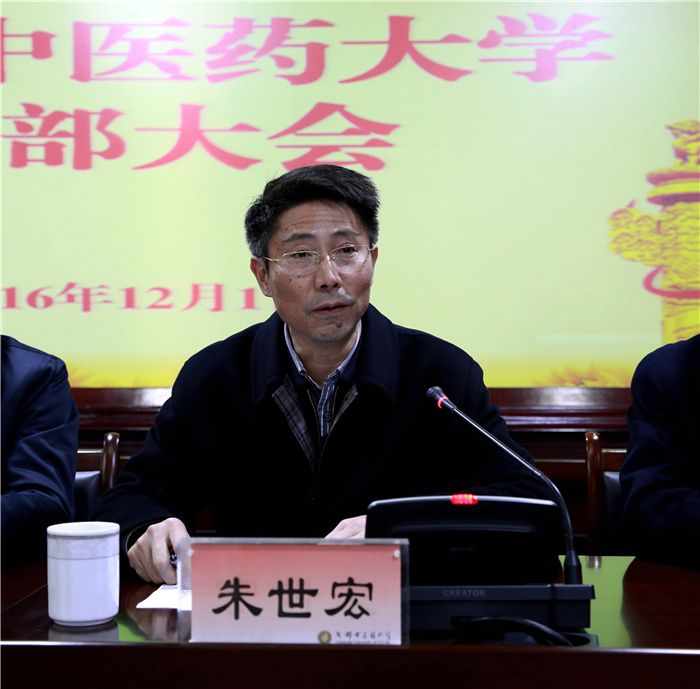 朱世宏强调指出,面对建设一流大学、一流学科的新形势新任务,希望学校把学习宣传贯彻党的十八届六中全会和省委十届九次全会精神作为当前和今后一个时期的重大政治任务,尤其要把学习贯彻全会精神纳入“两学一做”学习教育抓紧抓实。希望学校认真贯彻落实省委《关于进一步加强和改进高等学校党的建设的意见》精神,以加强和改进党的建设为核心,以落实大学章程为依托,进一步完善学校内部治理结构,提升内部治理能力,深入推进依法治校,加快形成现代大学治理体系。希望学校落实好省委、省政府刚刚印发的《四川省深化高等教育综合改革方案》,始终坚持把立德树人作为根本任务,强化内涵发展,强力推进综合改革和高水平中医药大学建设,特别要在“有特色、高水平”上下功夫,进一步强化在中药学、中医五官科学、针灸推拿学等方面的特色与优势,不断提高人才培养质量,推动学校办出特色、形成优势、争创一流。要大力培育一批全国领军人才,造就一批中医药专业人才集群,培养一批应用型技能型人才,为我省医疗卫生事业发展奠定坚实的人才基础。希望学校继续发扬优良传统,紧扣国家和我省重大战略需要,立足我省“健康四川”建设,特别是我省中医药发展规划,加强多学科联合科研攻关,加快科研成果的转化,加强中医药对外交流合作,促进中医药传承创新,大力推动生命信息、健康管理、养生保健等健康产业快速发展,不断提升学校和四川中医药在全国的影响,为我省加快中医药大省向中医药强省转变做出积极贡献。希望学校充分发挥中医药在疾病预防、治疗、养生、康复、养老等方面的优势,加强急需紧缺人才培养和学生公共卫生教育力度,不断提升服务基层的能力和水平,努力满足广大人民群众多元化的健康需求。要积极参与贫困地区、民族地区的健康扶贫工程,助力贫困地区、民族地区补齐医疗服务“短板”,为我省加快建成西部中医药高地、全国区域中医药中心培养更多优秀人才,为我省实施“三大发展战略”、推进“两个跨越”做出更大贡献。