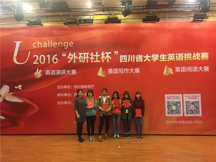 10月23日,2016“外研社杯”四川省大学生英语挑战赛在四川大学望江校区举行。大赛由四川省教育厅主办,四川大学、外语教学与研究出版社承办,包含英语演讲大赛、英语写作大赛和英语阅读大赛三项赛事,共有40所川内高校100多人参赛。Beat365官网外语学院学生曹圆梦、钟燕梅、李琴莹,护理学院学生杨倩瑜,第二临床医学院学生杨梦颖在外语学院教师孟悦的带领下参加比赛,分别获得英语演讲比赛三等奖一项,英语写作、阅读比赛三等奖各两项的好成绩。
