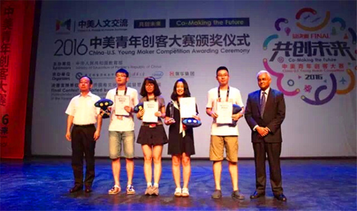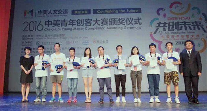 2016“共创未来——中美青年创客大赛”由教育部主办,教育部留学服务中心、清华大学、英特尔(Intel)公司、北京歌华文化发展集团共同承办。大赛以“共创未来”为主题,促进中美人文交流为特色,历时3个多月,吸引了近800支团队,中美两国青年近3000人报名。参赛作品结合创新设计理念和前沿科技,涉及社区、教育、环保、健康、交通、能源等多个可持续发展领域。颁奖礼上中华人民共和国教育部国际交流与合作司司长许涛,美国驻华大使馆使团副团长、公使David H.Rank等出席颁奖典礼并为本次大赛的获奖团队颁奖、致辞。