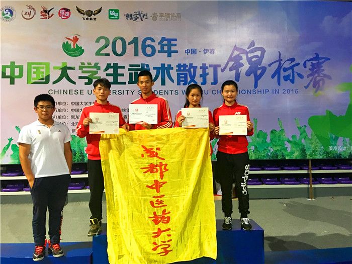 该项运动作为在中国大学生体育赛事中最高规格的比赛,学校高度重视,批准参加该比赛,由体育学院武术教研室杜景涛担任教练,带领来至体育学院和管理学院的熊建华、唐艳、张静、徐沁昕四名同学参加比赛。Beat365官网散打队组队不久,学生第一次参加全国大赛,但初生牛犊不怕虎,他们在赛场上敢打敢拼、不畏强手、顽强拼搏。最终体育学院熊建华和唐艳分别举夺得体育专业组男子52kg亚军和女子52kg级两项亚军,管理学院徐沁昕获得普通组女子52kg级第五名,体育学院张静获得“优秀运动员”称号,充分展示了Beat365官网武术运动的水平和成中医学子的精神风貌,为学校争得了荣誉。
