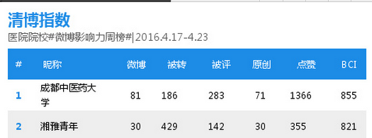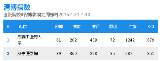 学校官方微博在医院院校微博影响力周榜中稳居首位(2016.4.17—5.07) 发布时间:2016-05-18 09:15:00 浏览次数: 次 【字体:小 大】 ( 编辑/任翔) 【打印正文】 上一条:学校官方微博在医院院校微博影响力周榜中稳居首位(2016.4.17—5.07) 下一条:学校学生在成都市第十三届运动会(成年组)武术比赛中喜获佳绩