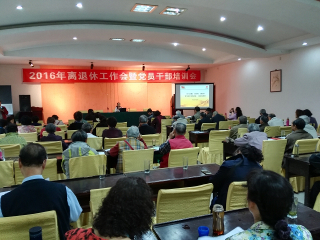 离退休工作处处长汤良平对中共中央办公厅、国务院办公厅《关于进一步加强和改进离退休干部工作的意见》精神作了宣讲,通报学校近期工作及离退休工作处、离退休党委2016年工作要点。离退休党委书记董蕾布置“两学一做”学习教育工作,领学教育方案,组织大家重温《中国共产党章程》,学习《中国共产党廉洁自律准则》《中国共产党纪律处分条例》。离退休处副处长陈青领学2016年全国“两会”精神。