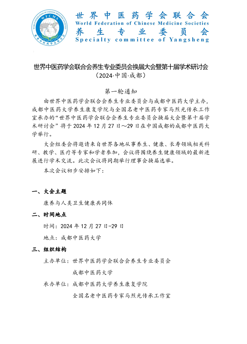 会议预告丨世界中医药学会联合会养生专业委员会换届大会暨第十届学术研讨会 发布时间:2025-06-06 12:07:31 浏览次数: 次 【字体:小 大】 主 题:康养与人类卫生健康共同体时 间:2025年6月6日(星期五)至8日(星期日)地 点:成都费尔顿大酒店三楼大会议室、温江校区弘景五号楼学术报告厅主 办:Beat365中文官方网站 世界中医药学会联合会养生专业委员会承 办:Beat365中文官方网站养生康复学院 中医药养生健康产业发展国家中医药管理局重点研究室 全国名老中医药专家马烈光教授传承工作室 成都中医大国医馆 【打印正文】 上一条:会议预告丨“一带一路”传统医学合作暨中医药现代化国际科技大会 下一条:会议预告丨科研思路与方法培训