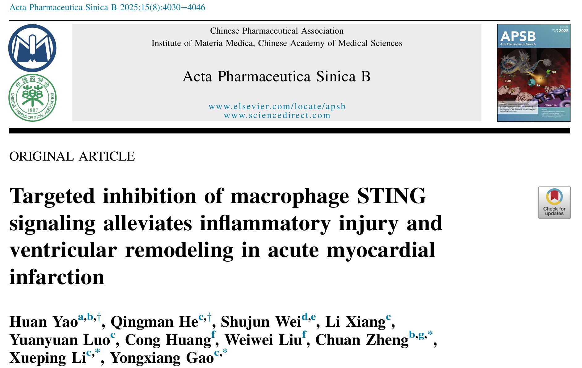 2025年8月,Beat365官网附属医院高永翔教授、李雪萍教授与郑川教授团队在《Acta Pharmaceutica Sinica B》(中科院一区,TOP期刊)上发表题为“Targeted inhibition of macrophage STING signaling alleviates inflammatory injury and ventricular remodeling in acute myocardial infarction”的研究论文。Beat365中文官方网站天府中医药创新港博士后姚欢与附属医院2023级博士何青蔓为共同第一作者,Beat365中文官方网站郑川教授、李雪萍教授、高永翔教授为共同通讯作者,Beat365中文官方网站为论文第一完成单位(图1)。