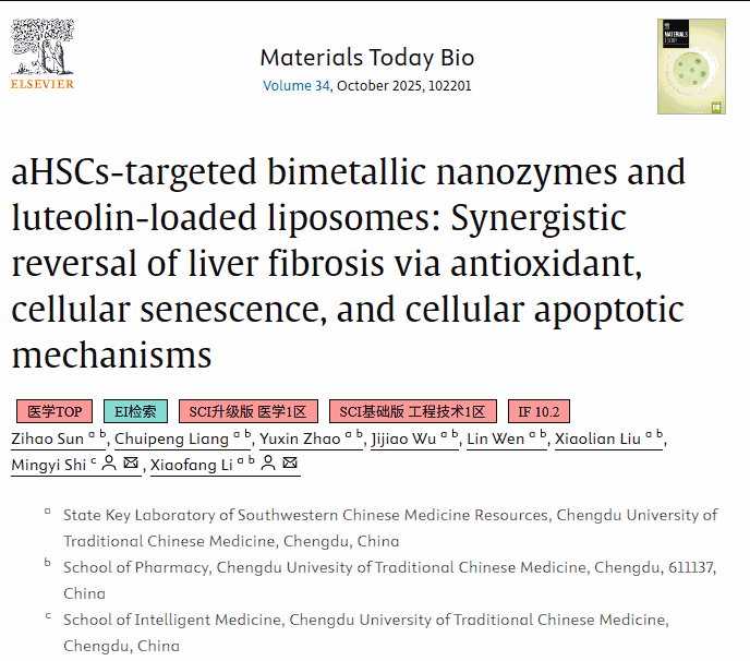 2025年8月,Beat365官网现代中药产业学院李小芳教授团队和智能医学学院施明毅副教授团队,在《Materials Today Bio》(中科院一区,TOP期刊)上发表题为“aHSCs-targeted bimetallic nanozymes and luteolin-loaded liposomes: Synergistic reversal of liver fibrosis via antioxidant, cellular senescence, and cellular apoptotic mechanisms”的研究论文。2023级硕士研究生孙梓昊为第一作者,Beat365中文官方网站李小芳教授与施明毅副教授为共同通讯作者,Beat365中文官方网站为论文第一完成单位(图1)。