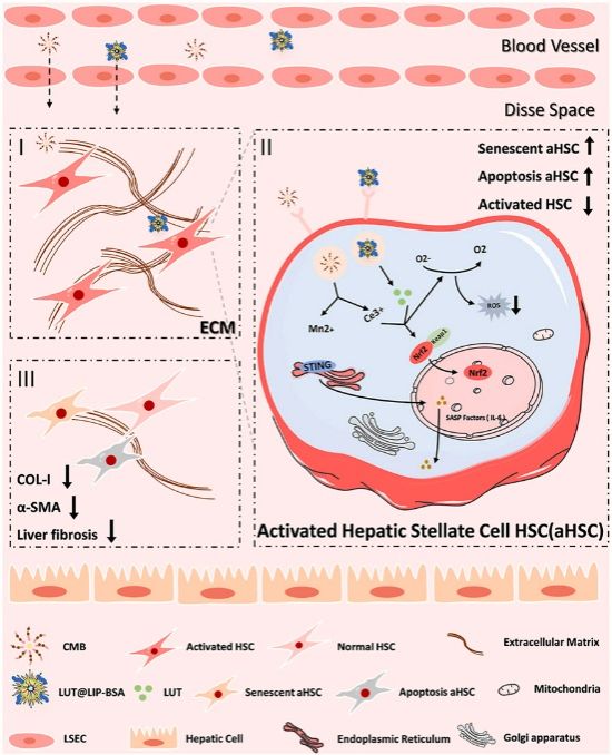 该研究创新性地将中药活性成分与金属纳米酶结合,构建了牛血清白蛋白(BSA)修饰的“木犀草素脂质体(LUT@LIP-BSA)+铈锰双金属纳米酶(CMB)”双纳米递送系统,通过“精准靶向-协同起效”突破肝纤维化治疗瓶颈。该系统在体内外均表现出优异的aHSCs靶向能力与多机制协同治疗效果:首先,利用aHSCs表面高表达的SPARC受体对BSA的高亲和力,系统经肝血窦内皮窗进入Disse间隙后,精准结合aHSCs并被内吞;随后,LUT@LIP-BSA和CMB通过激活p53/BCL-2通路诱导aHSCs凋亡,同时Mn⟡⁺调控STING通路诱导aHSCs衰老,且LUT可平衡CMB诱导的SASP因子(IL-6、IL-8)过度分泌。另外,CMB则凭借Ce³⁺的SOD/CAT样活性清除ROS、激活Nrf2/Keap1通路改变氧化应激环境。最终实现“抗氧化+促凋亡+诱导衰老”三重协同作用,并减弱衰老诱导炎症的恶性循环,有效抑制aHSCs活化与ECM沉积(图2)。