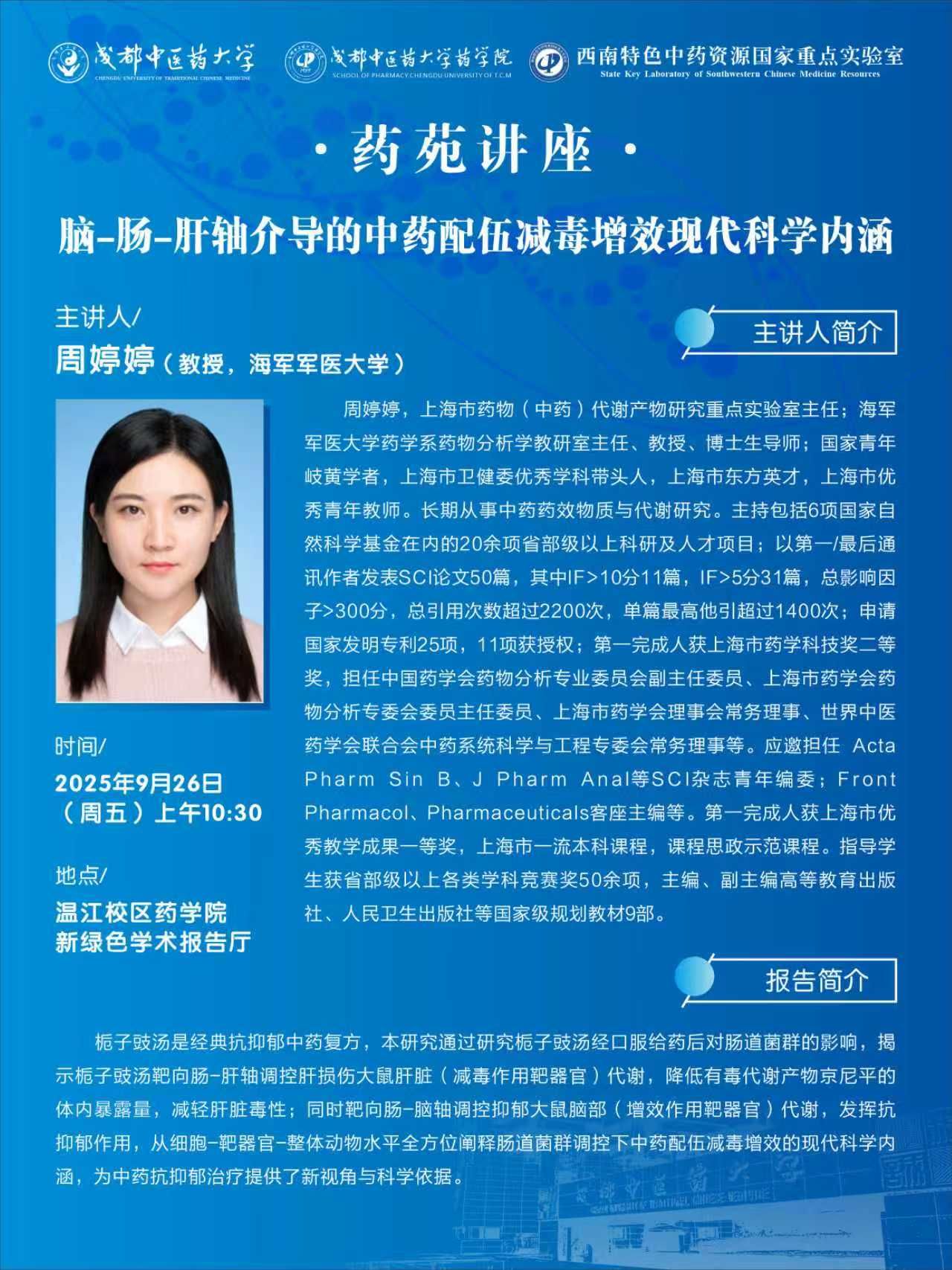 会议预告丨药苑讲座 发布时间:2025-09-23 16:00:29 浏览次数: 次 【字体:小 大】 题 目:脑-肠-肝轴介导的中药配伍减毒增效现代科学内涵时 间:2025年9月26日(星期五) 上午10:30地 点:温江校区药学院新绿色学术报告厅主讲人:周婷婷 海军军医大学主 办:Beat365中文官方网站 Beat365中文官方网站药学院 西南特色中药资源国家重点实验室 【打印正文】 上一条: 学术成果丨Beat365官网学者构建基于AI与知识图谱的中医药多维数据挖掘与机制解析平台 下一条:会议预告丨蓉“成”汇聚,“职”等您来| 第九届国际生物医药与中医药青年论坛