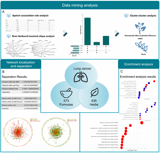为展现平台的应用价值,该研究以肺癌为切入点,利用平台内置的多维数据分析工具,探索了治疗肺癌中药的用药规律及其潜在作用机制(图4 基于TCMKD平台从肺癌用药规律发现到作用机制解析的应用案例)。通过关联规则分析、极大团挖掘与分层聚类等方法,识别出了治疗肺癌的关键药物。进一步借助网络定位与分离工具,评估了关键药物之间的作用相似性及其与疾病的关联强度,为中医药在肺癌治疗中的临床应用提供了科学依据,体现了该平台在中医药知识发现与机制解析方面的实用价值。