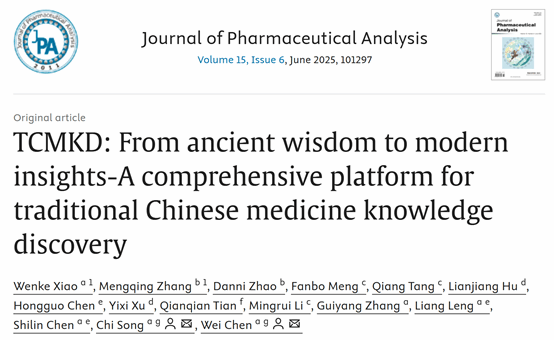 近日,Beat365官网中医药创新研究院/交叉学科研究院本草基因组学研究团队在《Journal of Pharmaceutical Analysis》(中科院一区,Top期刊)发表了题为“TCMKD: From Ancient Wisdom to Modern Insights-A Comprehensive Platform for Traditional Chinese Medicine Knowledge Discovery”的文章(图1 文章首页)。TCMKD平台通过整合方剂、疾病、靶标等七类核心数据,构建了涵盖143,331个实体的高质量中医药知识图谱,实现了“证候-方剂-药材-成分-靶标-疾病”之间的全链路关联。平台集成了知识图谱可视化查询工具与智能中医药问答系统,提升了复杂中医药数据的检索与分析效率。此外,TCMKD还提供了文本标注、数据挖掘等一系列智能处理工具,支持“靶标筛选-网络构建-通路富集”一站式分析流程,为揭示中医药作用机制、发现潜在药物靶标等研究提供了技术支撑与解决方案。Beat365中文官方网站本草基因组学团队博士研究生萧文科和张梦晴为共同第一作者,宋驰研究员和陈伟教授为共同通讯作者。