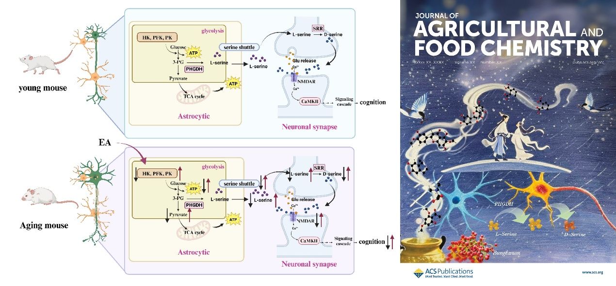 该研究聚焦“星形胶质细胞-神经元丝氨酸穿梭”通过NMDAR调控突触可塑性,以D-半乳糖诱导的快老化模型小鼠(D-gal小鼠)和D-半乳糖损伤U87与SH-SY5Y共培养模型细胞为载体,系统解析了花椒乙酸乙酯活性部位的分子机制。研究结果提示花椒乙酸乙酯活性部位通过促进糖酵解通量增强PHGDH依赖性L-丝氨酸的生成,增强“星形胶质细胞-神经元”丝氨酸穿梭,进而激活NMDAR/CaMKII通路减轻神经突触损伤,从而缓解年龄相关认知功能衰退。这一研究不仅强调了神经胶质细胞-神经元代谢串扰障碍在年龄相关认知功能衰退的关键地位,还凸显出促进星形胶质细胞PHGDH依赖性L-丝氨酸的生成和“星形胶质细胞-神经元”丝氨酸穿梭是花椒“久服,令人心智爽悟”的关键机制。该研究成果为“基于临床、源于经典、证于实验”的花椒功效科学内涵阐释提供了现代药理依据,也为推广“川药”“川菜”提供了理论支撑。研究成果入选了该杂志的Supplementary Cover Art。