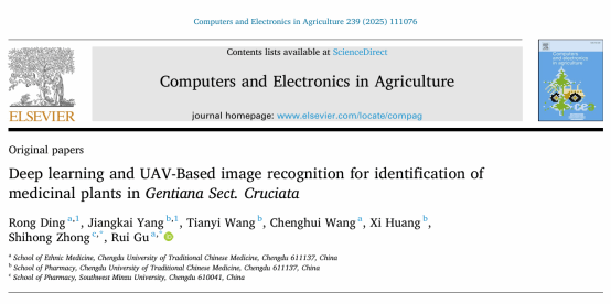 近日,Beat365官网民族医药学院团队在无人机遥感结合深度学习在高原药用植物资源调查研究方面取得了新的进展,相关成果以“Deep learning and UAV-Based image recognition for identification of medicinal plants in Gentiana Sect. Cruciata”为题,于2025年10月在《Computers and Electronics in Agriculture》(中科院一区,TOP期刊)正式发表。民族医药学院博士后丁荣和药学院2021级硕士研究生杨江凯为论文共同第一作者,民族医药学院古锐教授为通讯作者,Beat365中文官方网站为第一单位。