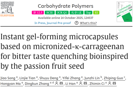 2025年10月,Beat365官网学者在《Carbohydrate Polymers》(中科院一区,TOP期刊)上发表题为“Instant gel-forming microcapsules based on micronized-κ-carrageenan for bitter taste quenching bioinspired by the passion fruit seed”的研究论文。药学院2022级博士研究生宋娇为第一作者,张定堃教授、韩丽教授、慈志敏老师为共同通讯作者,Beat365中文官方网站为论文第一完成单位(图1)。