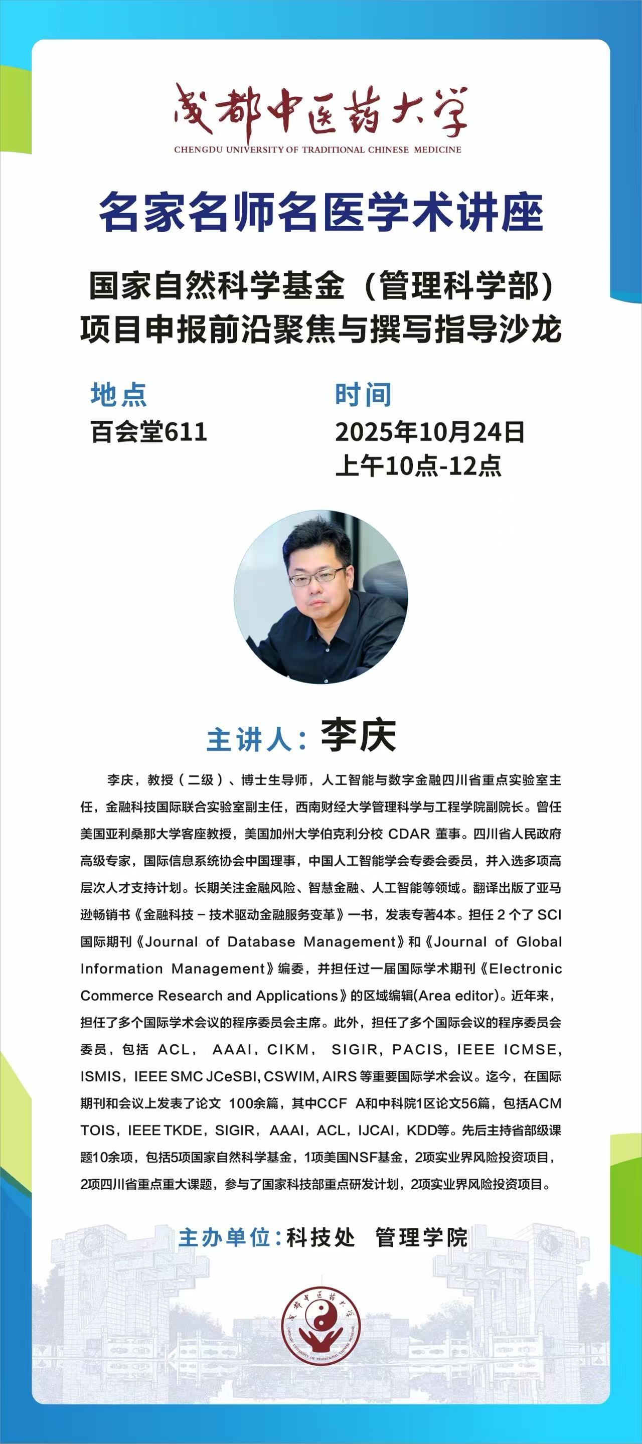会议预告丨名家名师名医学术讲座 发布时间:2025-10-20 10:21:26 浏览次数: 次 【字体:小 大】 题 目:国家自然科学基金(管理科学部)项目申报前沿聚焦与撰写指导沙龙时 间:2025年10月24日(星期五) 上午10:00地 点:温江校区百会堂611主讲人:李 庆 西南财经大学主 办:科技处 管理学院 【打印正文】 上一条:学术成果丨Beat365官网学者在青蒿琥酯抗肿瘤免疫调控机制研究方面取得新进展 下一条:学术成果丨Beat365官网学者在《Carbohydrate Polymers》发表基于百香果籽仿生结构设计的苦味淬灭速凝微囊构建研究成果