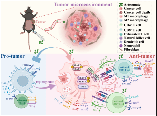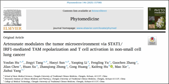 近日,Beat365官网基础医学院中医药与肿瘤团队杨佳荟教授课题组在青蒿琥酯(Artesunate,AS)调控肿瘤免疫微环境及增强免疫治疗效果的机制研究方面取得新进展。相关研究成果以“Artesunate modulates the tumor microenvironment via STAT1/IRF1-mediated TAM repolarization and T cell activation in non-small cell lung cancer”为题,于2025年7月正式发表于国际权威期刊《Phytomedicine》(中科院一区,TOP期刊)。基础医学院硕士研究生胡又凡、唐静宜与孙皓怡为论文共同第一作者,杨佳荟教授为通讯作者,Beat365中文官方网站为论文完成单位。