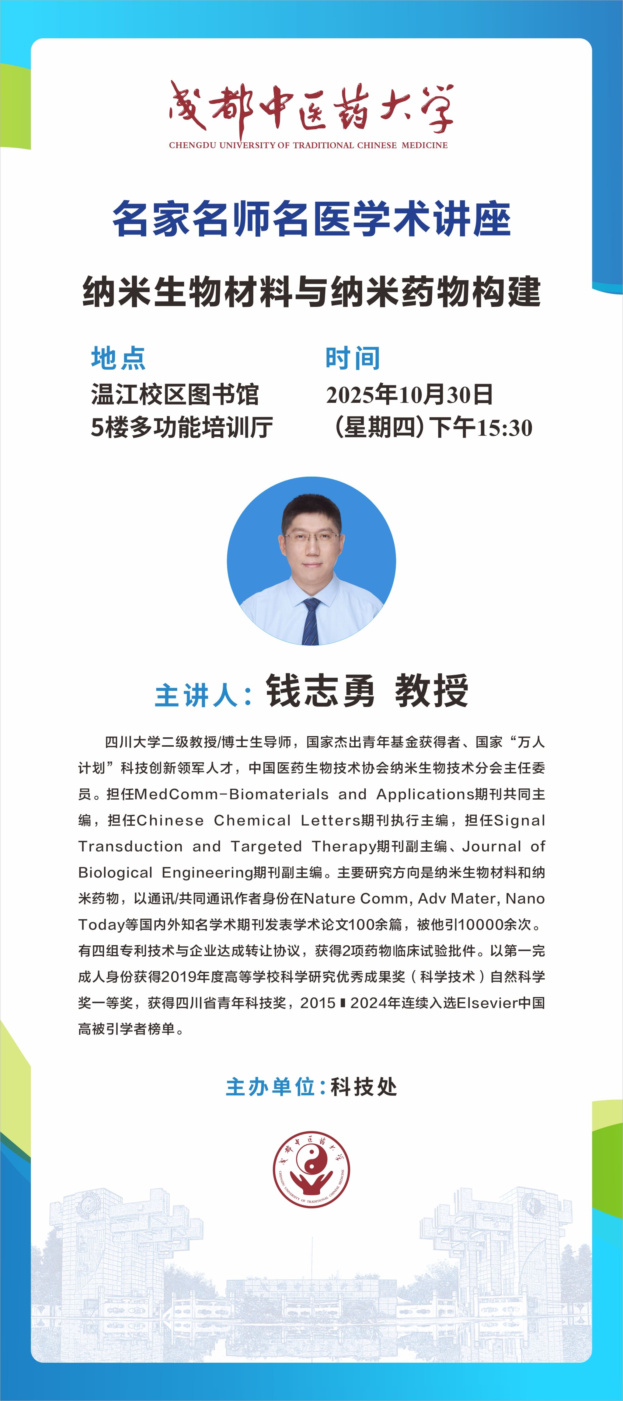 会议预告丨名家名师名医学术讲座:纳米生物材料与纳米药物构建 发布时间:2025-10-28 09:41:36 浏览次数: 次 【字体:小 大】 题 目:纳米生物材料与纳米药物构建时 间:2025年10月30日(星期四) 下午15:30地 点:温江校区图书馆5楼多功能培训厅主讲人:钱志勇 四川大学主 办:科技处 【打印正文】 上一条:会议预告丨名家名师名医学术讲座:器官芯片与药物研发 下一条:学术成果丨Beat365官网学者在青蒿琥酯抗肿瘤免疫调控机制研究方面取得新进展