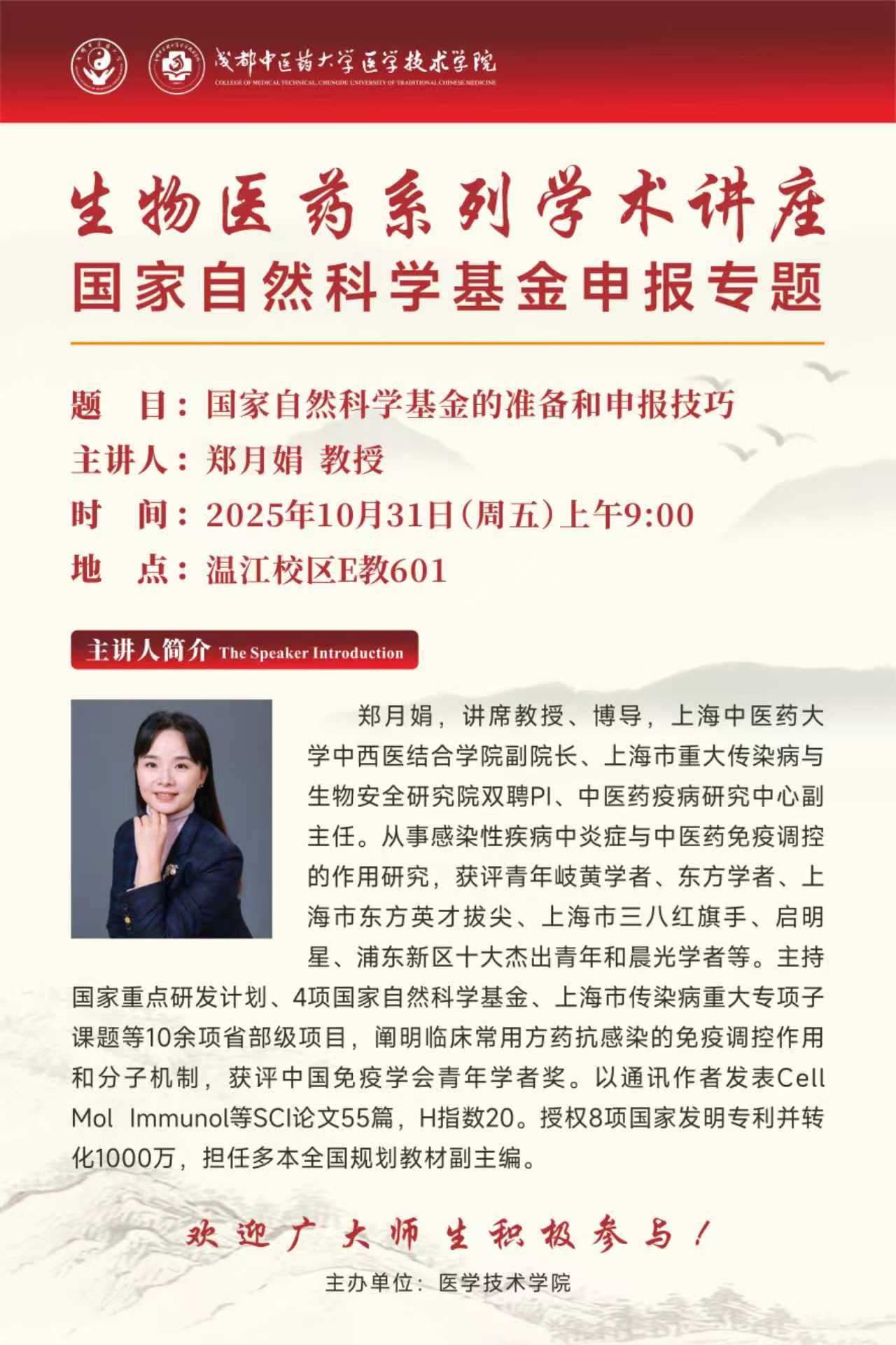 会议预告丨生物医药系列学术讲座 国家自然科学基金申报专题 发布时间:2025-10-31 08:37:44 浏览次数: 次 【字体:小 大】 题 目:国家自然科学基金的准备和申报技巧时 间:2025年10月31日(星期五) 上午09:00地 点:温江校区E教601主讲人:郑月娟 上海中医药大学主 办:医学技术学院 【打印正文】 上一条:会议预告丨名家名师名医学术讲座 Beat365中文官方网站2026年度国家自然科学基金申报科研思路与方法培训 下一条:会议预告丨名家名师名医学术讲座:器官芯片与药物研发