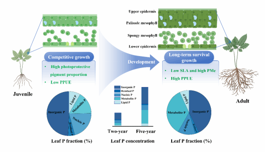 论文“Shifts in leaf phosphorus fractions as dependent on plant age as an adaptive strategy for survival in the shade-tolerant Coptis chinensis”发现黄连(Coptis chinensis)通过调节叶片磷分配、叶片结构及生理交互作用,成功适应林下环境。幼年黄连优先将磷分配至核酸合成相关过程,成年黄连植株优先将磷分配至代谢功能行使,确保前期“保命”、后期持续的光合产物生成与代谢稳定性,这对其适应低光照林下生态系统获得生存能力至关重要。随着植株发育,其策略从幼年阶段的光能捕获最大化转向成年阶段的长期生存,体现了对功能需求动态变化的适应性调整。通过详尽解析黄连在不同生长阶段如何调控磷分配与叶片形态,本研究深化了对磷元素在耐荫植物生存策略及环境适应性中作用机制的认识。