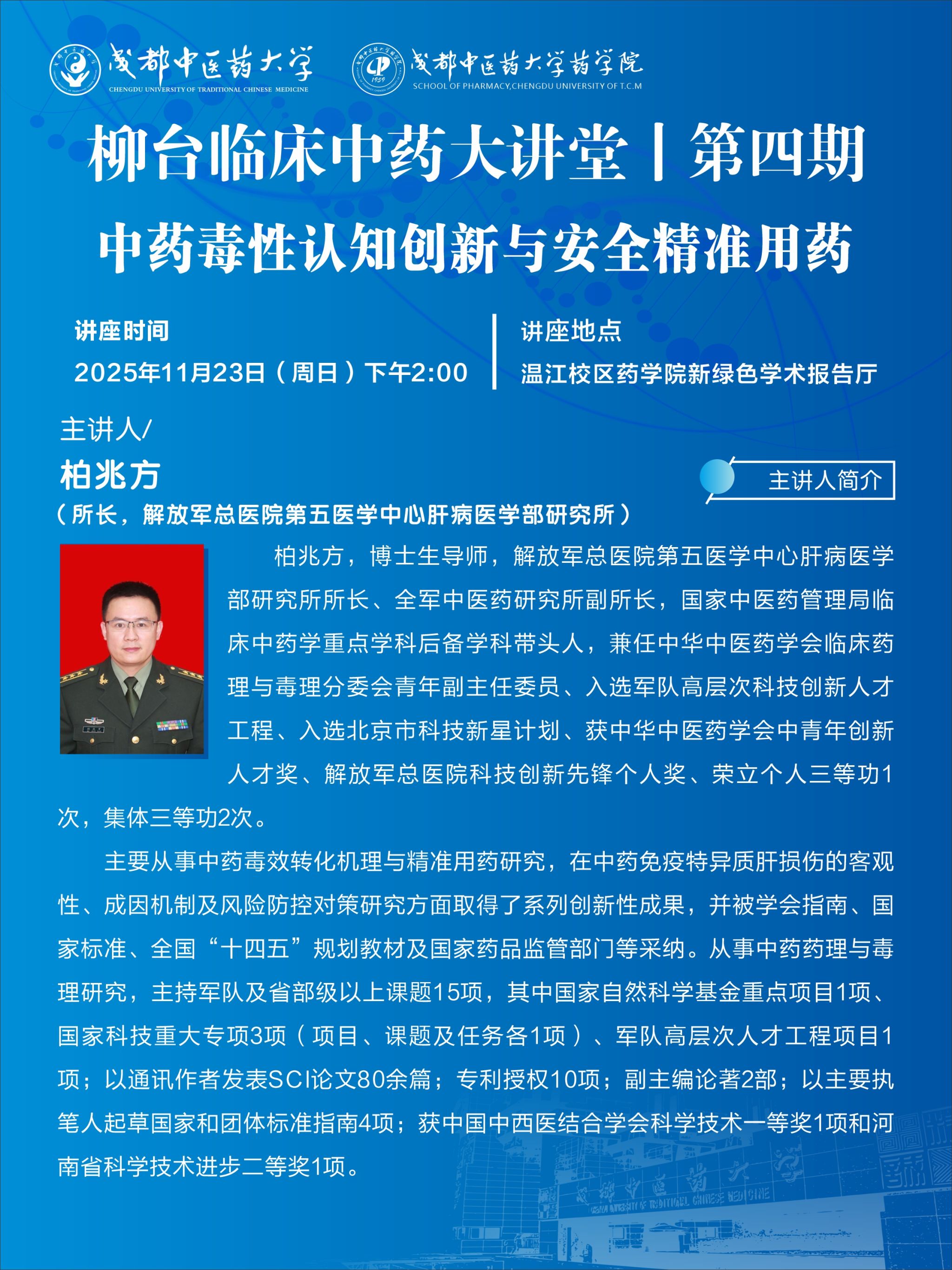 会议预告丨柳台临床中药大讲堂第四期 发布时间:2025-11-20 10:55:06 浏览次数: 次 【字体:小 大】 题 目:中药毒性认知创新与安全精准用药时 间:2025年11月23日(星期日) 下午14:00地 点:温江校区药学院新绿色学术报告厅主讲人:柏兆方 解放军总医院第五医学中心肝病医学部研究所主 办:Beat365中文官方网站 Beat365中文官方网站药学院 【打印正文】 上一条:学术成果丨Beat365官网学者在设计构建选择性PI3Kγ抑制剂化合物库领域取得进展 下一条:会议预告丨四川省博士后学术交流活动暨第九届国际生物医药与中医药青年论坛