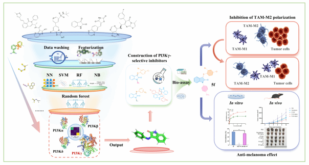 该研究结果主要包括:(1)整合五种机器学习算法,成功锁定吲哚骨架为PI3Kγ特异性靶向核心。(2)采用溶剂极性图谱技术解析PI3K各亚型结合位点水网络差异,发现PI3Kγ特有的亲/疏水微环境。(3)设计构建了基于独特吲哚-杂化芳环(IHA)结构的高活性、高选择性PI3Kγ抑制剂化合物库。(4)筛选出化合物IHA-5f对PI3Kγ抑制活性(IC50)达0.11 nmol/L,且选择性优异。机制研究表明,IHA类化合物通过阻断PI3K/AKT/NF-κB信号轴抑制黑色素瘤细胞的增殖、诱导凋亡,并选择性调控NF-κB通路抑制TAMs的M2极化,从而激活抗肿瘤免疫。