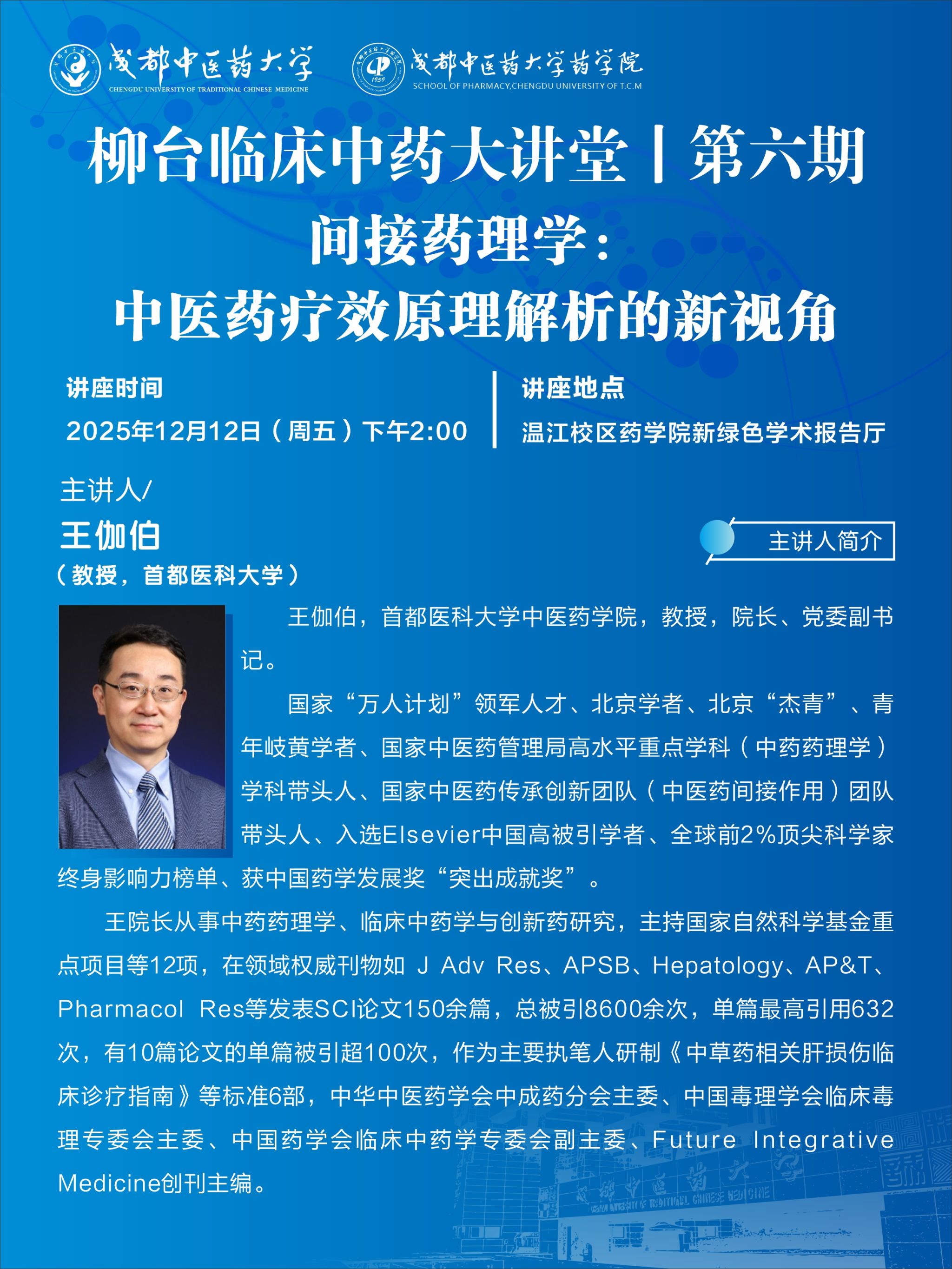 会议预告丨柳台临床中药大讲堂第六期 发布时间:2025-12-12 10:25:48 浏览次数: 次 【字体:小 大】 题 目:间接药理学:中医药疗效原理解析的新视角时 间:2025年12月12日(星期五) 下午14:00地 点:温江校区药学院新绿色学术报告厅主讲人:王伽伯 首都医科大学主 办:Beat365中文官方网站 Beat365中文官方网站药学院 【打印正文】 上一条:学术成果丨Beat365官网学者在川芎水稻轮作内在机制解析系列研究中取得新进展 下一条:会议预告丨药苑讲座