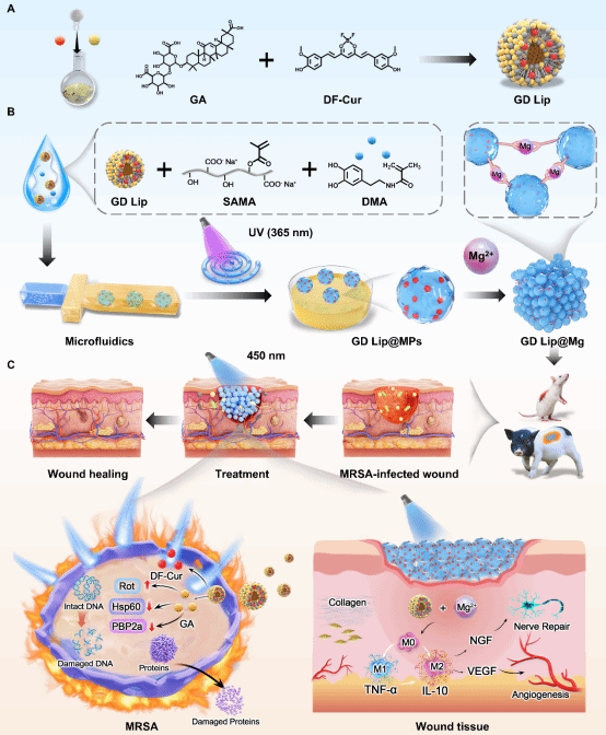 该研究构建了一种集“高效抗菌”与“免疫修复”于一体的微凝胶递药系统(GD Lip@Mg)。该系统以二氟硼姜黄素(DF-Cur)作为稳定光热剂,甘草酸(GA)则兼具载体功能与细菌HSP60抑制作用,可逆转MRSA的光热耐受性。通过微流控技术,将负载DF-Cur与GA的脂质体封装于甲基丙烯酰化海藻酸钠微球中,并借助多巴胺衍生物(DMA)的邻苯二酚基团与Mg²⁺螯合,最终形成结构稳定且具有粘附性的微凝胶。该微凝胶在450 nm激光照射下能产生可控局部热效应,迅速杀灭细菌。同时,其缓释的Mg²⁺与活性成分可促进巨噬细胞由促炎M1型向修复M2型极化,减轻炎症反应,并通过上调神经生长因子(NGF)、下调基质金属蛋白酶(MMP)等机制,协同促进血管新生、胶原沉积与上皮再生,从而系统性地加速感染伤口愈合。该疗效已在大鼠与巴马小型猪的MRSA感染全层皮肤缺损模型中得到验证。