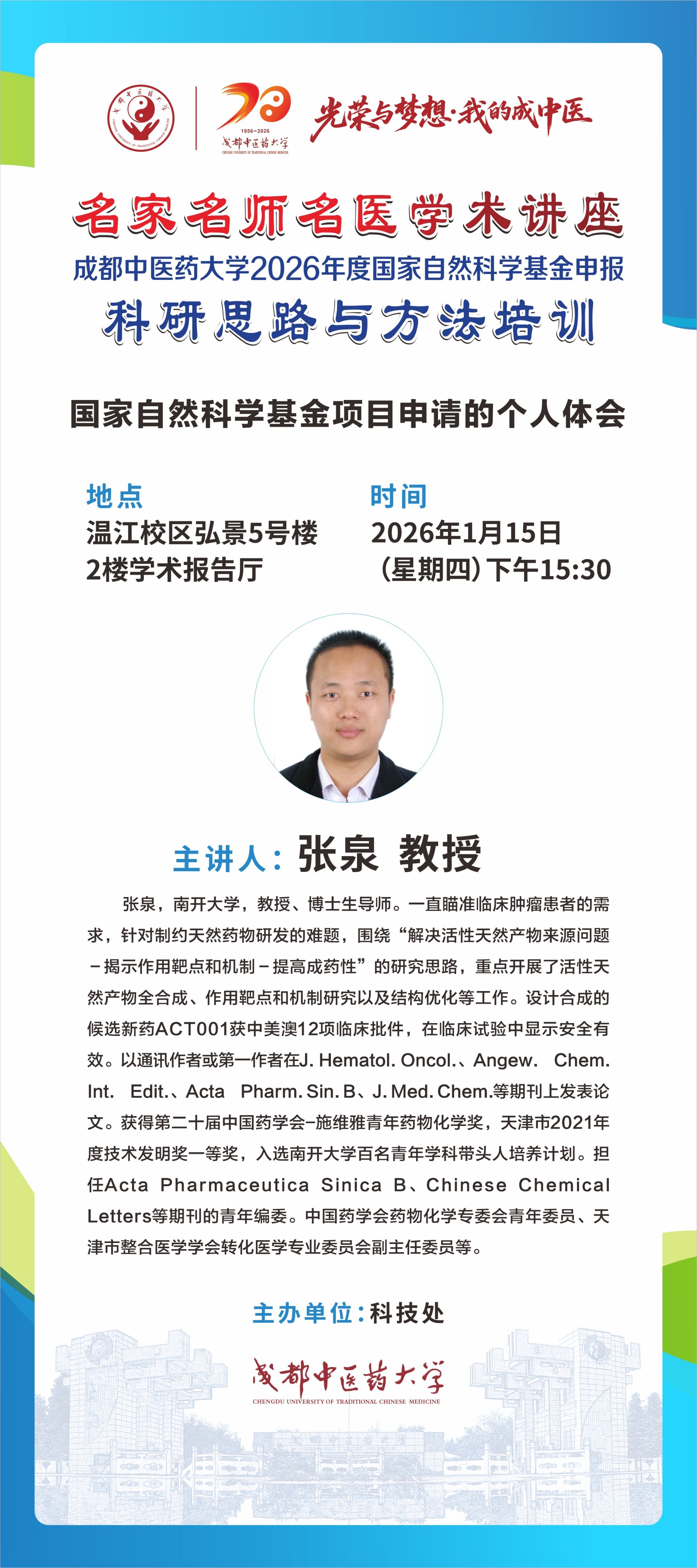 会议预告丨名家名师名医学术讲座 Beat365中文官方网站2026年度国家自然科学基金申报科研思路与方法培训 发布时间:2026-01-12 10:54:12 浏览次数: 次 【字体:小 大】 题 目 1:植物内生真菌天然产物化学生物学研究时 间:2026年1月15日(星期四) 下午14:30主讲人:杨小龙 安徽中医药大学题目 2:国家自然科学基金项目申请的个人体会时 间:2026年1月15日(星期四) 下午15:30主讲人:张 泉 南开大学 地 点:温江校区弘景5号楼2楼学术报告厅主 办:科技处 【打印正文】 上一条:会议预告丨名家名师名医学术讲座 Beat365中文官方网站2026年度国家社会科学基金申报科研思路与方法培训 下一条:学术成果丨Beat365官网学者在《Drug Resistance Updates》发表光热微凝胶递药体系促进耐药菌感染伤口愈合的研究成果
