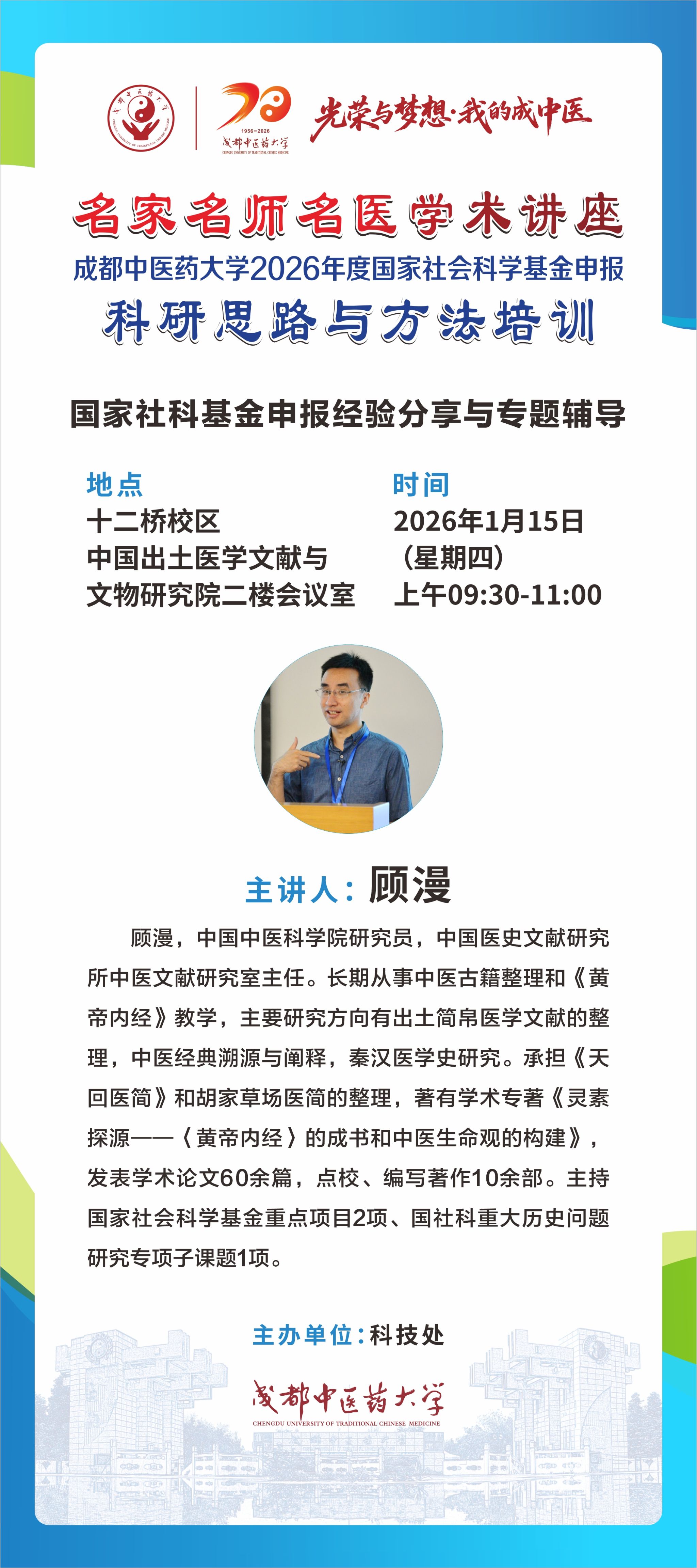 会议预告丨名家名师名医学术讲座 Beat365中文官方网站2026年度国家社会科学基金申报科研思路与方法培训 发布时间:2026-01-14 08:55:40 浏览次数: 次 【字体:小 大】 题 目:国家社科基金申报经验分享与专题辅导时 间:2026年1月15日(星期四) 上午09:30地 点:十二桥校区中国出土医学文献与文物研究院二楼会议室主讲人:顾漫 中国中医科学院主 办:科技处 【打印正文】 上一条:学术成果丨Beat365官网学者提出植物源抗癌药物紫杉醇可持续性生产的合成生物学路线图 下一条:会议预告丨名家名师名医学术讲座 Beat365中文官方网站2026年度国家自然科学基金申报科研思路与方法培训