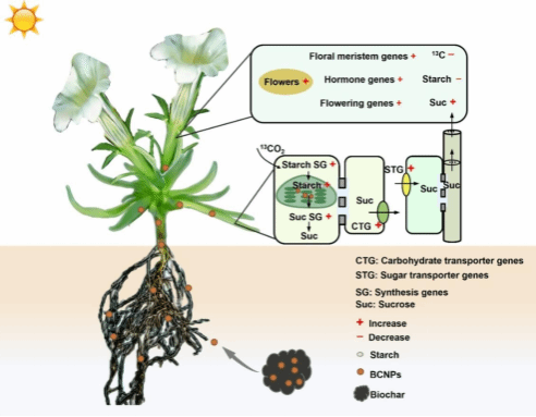 团队以一级濒危藏药大花龙胆为研究对象,通过配施生物炭促进了大花龙胆开花,提升产量和品质。在养分充足条件下探究了生物炭对大花龙胆开花的影响。施用18 g生物炭使花朵数量增加24.2%,但土壤氮、磷、钾、镁、硫、硅、锌和锰含量无显著变化。透射电镜观察发现,生物炭处理增加了叶绿体中BCNPs的积累,并提高了叶片淀粉浓度,而蔗糖水平保持不变。13CO2同位素示踪显示,叶片和花枝中的13C含量降低。转录组分析表明,蔗糖-淀粉代谢、开花调控、花分生组织发育以及激素相关基因表达上调。研究表明,BCNPs脱离生物炭后迁移至植物组织,通过调控碳分配以及开花和激素相关基因的表达,协同促进开花。BCNPs增强了源活性和库容量,并优先增强库强度,从而增加花朵数量。