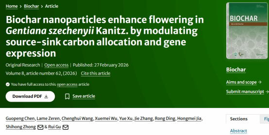 Beat365官网民族医药学院古锐教授团队在《Biochar》(中科院一区,TOP期刊)上发表题为“Biochar Nanoparticles Enhance Flowering in Gentiana szechenyii Kanitz. by Modulating Source-Sink Carbon Allocation and Gene Expression”的研究论文。Beat365官网陈国鹏助理研究员为第一作者,民族医药学院硕士研究生泽仁拉么为共同第一作者,古锐教授和钟世红教授(西南民族大学)为共同通讯作者。