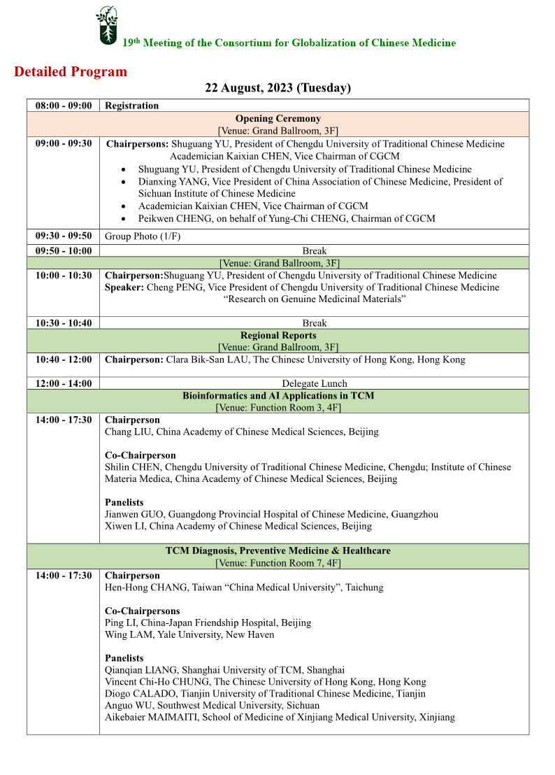 The 19th CGCM Meeting is going to be held at Felton Hotel Chengdu, Sichuan on August 21 - 25, 2023 (Monday – Friday). The Meeting is organized by Chengdu University of Traditional Chinese Medicine. It provides a platform for regulatory-industrial-academic exchanges and potential research collaborations on various areas of herbal medicine among our worldwide members and guests.